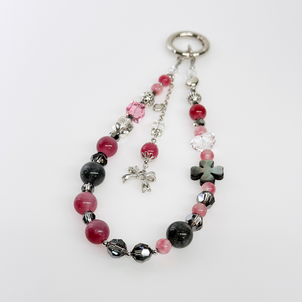 使用石:ブラックマイカストロベリークォーツ12㎜・チェリーブロッサムアゲート6㎜・クリムゾンアゲート10mm・黒蝶貝クローバー14mm・スワロフスキービーズ