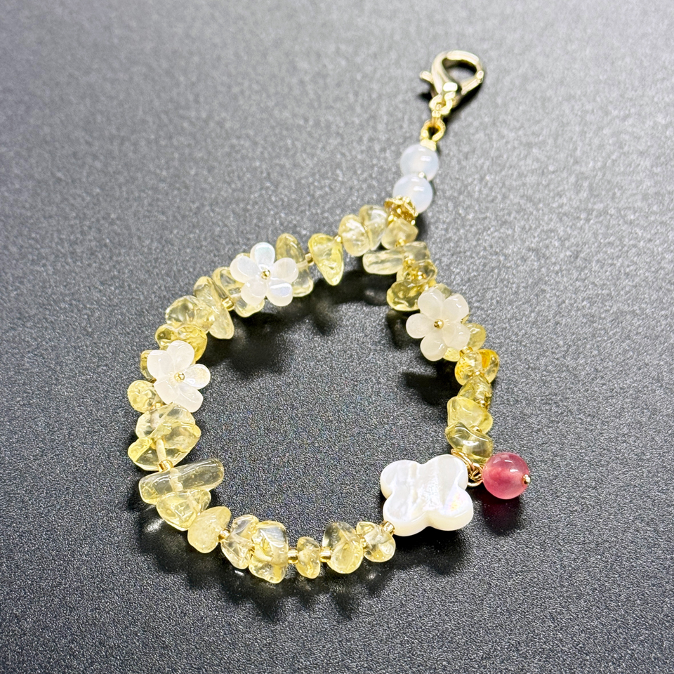 透明感のあるレモンクォーツは、気持ちを軽やかにし、思考をクリアに整えるサポートストーンとして知られています。日常の中でポジティブな流れを引き寄せたい方におすすめです。 使用石:レモンクォーツサザレ・ホワイトシェルクロス14mm・チェリーブロッサムアゲート6㎜・ホワイトメノウ6㎜・フラワービーズ 全長 約11.5cm 価格 11000円(税込)