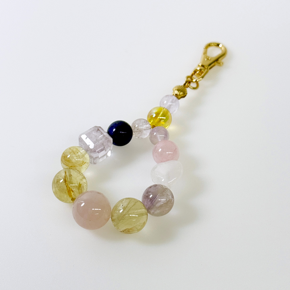 柔らかなピンクと紫がふんわりと心をほぐし、優しい色合いのレモンクォーツがそっと温もりを添えてくれます。深いブルーの静けさが加わることで、日常に落ち着きと安らぎをもたらす、穏やかな調和のアイテムです。 使用石:ローズクォーツ8mm/10mm・レモンクォーツ8mm/10mm・ラピスラズリ8mm・アメジストラビットヘア9㎜・アメジストキューブ9㎜・アメジスト6㎜・ゴールデンオーラ8mm・ホワイトジェイドハート 全長 約9cm 価格 11000円(税込)