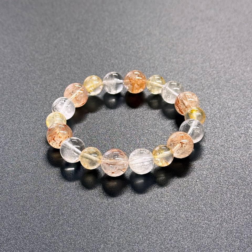 過去の痛みやトラウマをそっと癒し、心に希望の光をもたらしてくれる石たちです。穏やかな癒しと、未来へ進むための力強さが同時に得られる組み合わせです。 心を軽くしながら一歩踏み出したい方におすすめです。 使用石:アイリスクォーツ10mm・ブラックゴールドスーパーセブン11.2mm・ライモナイト9mm 内径 15.5㎝ 価格 13800円(税込)