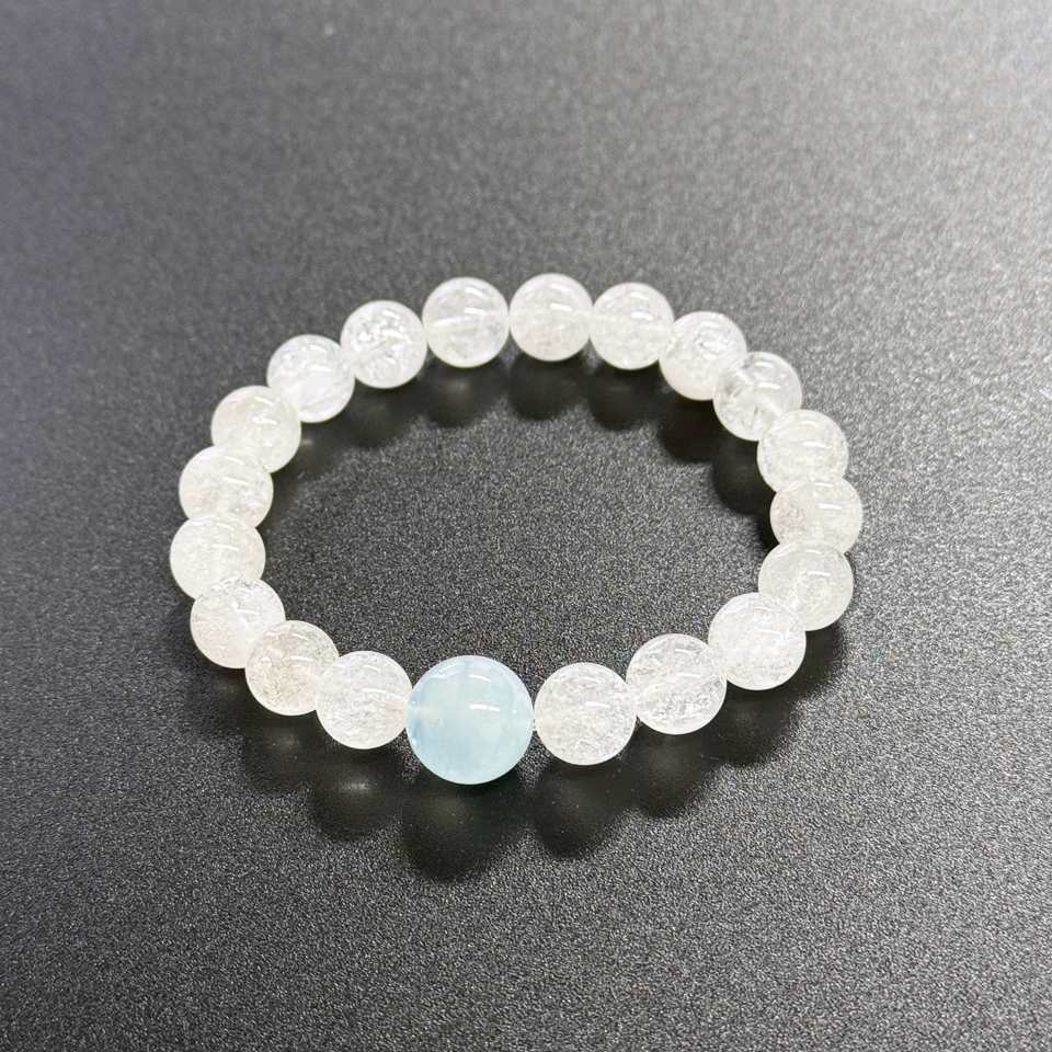 アイリスホワイトガーデンは浄化力が高く、アクアマリンは心を穏やかに保つ「守りの石」でもあり、2つが合わさることで、優しいけれど強いお守りになります。心のざわつきを落ち着かせ、素直な気持ちで物事に向き合いたい方におすすめです。 また、持つ人の視野を広げ、創造性をそっと引き出してくれます。仕事運アップ、前向きな判断力のサポートにも優れています。 使用石:アイリスホワイトガーデン10mm・アクアマリン12.5mm 内径 15.5㎝ 価格 15800円(税込)