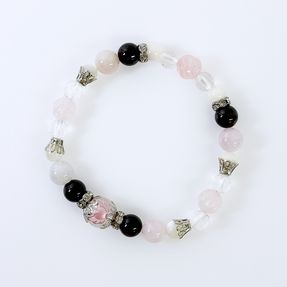 持つこと自体が婚活になるようなブレスレットです。幸せに満ち、愛情に溢れる家庭へと導きます。 使用石:ガーネット・モルガナイト・マザーオブパール・クリスタル・ローズクォーツ 内径 15cm 価格 32800円(税込)
