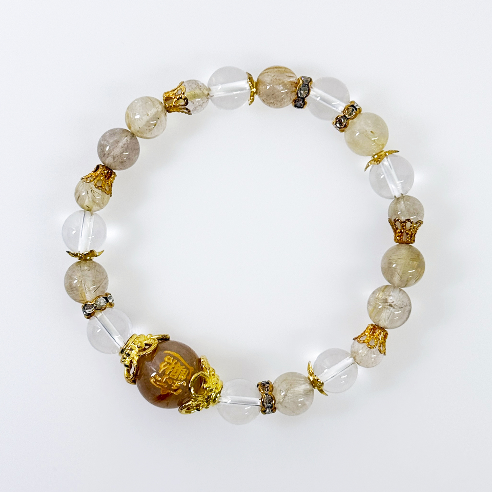 金運上昇の最高峰ルチルクォーツの中心石には財を招き、寶(宝)が入って来るという、縁起の良い文字(合字:たからぶね)が刻まれています。 使用石:クリスタル・ルチルクォーツ 内径 15cm 価格 35800円(税込)